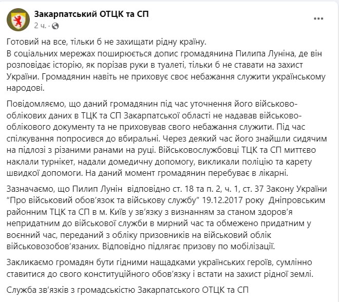 О том, как он был доставлен в ТЦК, не сообщается. Однако в сообщении говорится, что "во время общения" он попросился в уборную, где его с порезами на руках и нашли сотрудники ТЦК. На данный момент мужчина в больнице.
