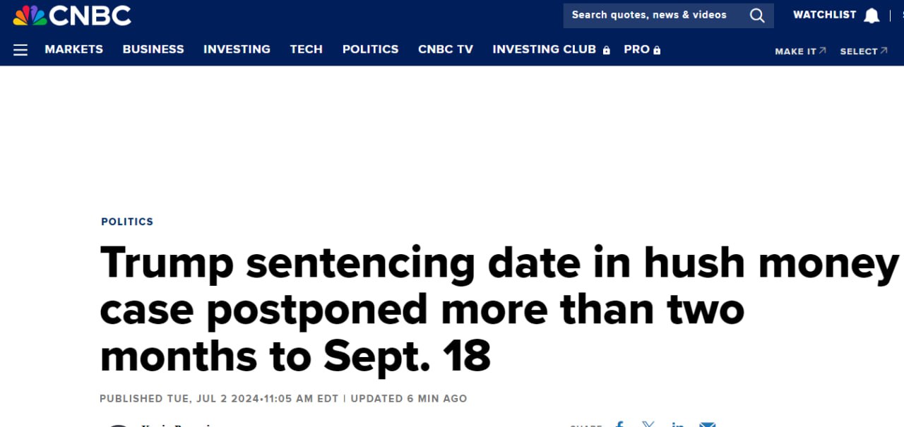 Ранее вынесение приговора было назначено на 11 июля. Съезд Республиканской партии, который выдвинет Трампа кандидатом в президенты, состоится в августе.