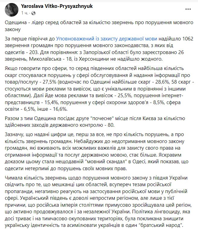 Витко-Присяжнюк сообщила, что в других южных областях гораздо меньше обращений по поводу нарушения языкового законодательства, а из Херсонской вообще нет ни одного. Но это свидетельствует "не о количестве нарушений, а о количестве обращений граждан, неравнодушных к несоблюдению языкового закона", резюмировала она.