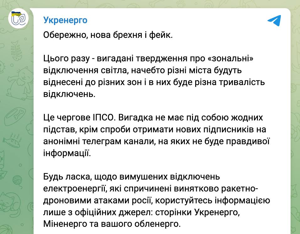В "Укрэнерго" заявили, что это информационно-психологическая операция (ИПСО), хотя ее и распространяют украинские ресурсы.