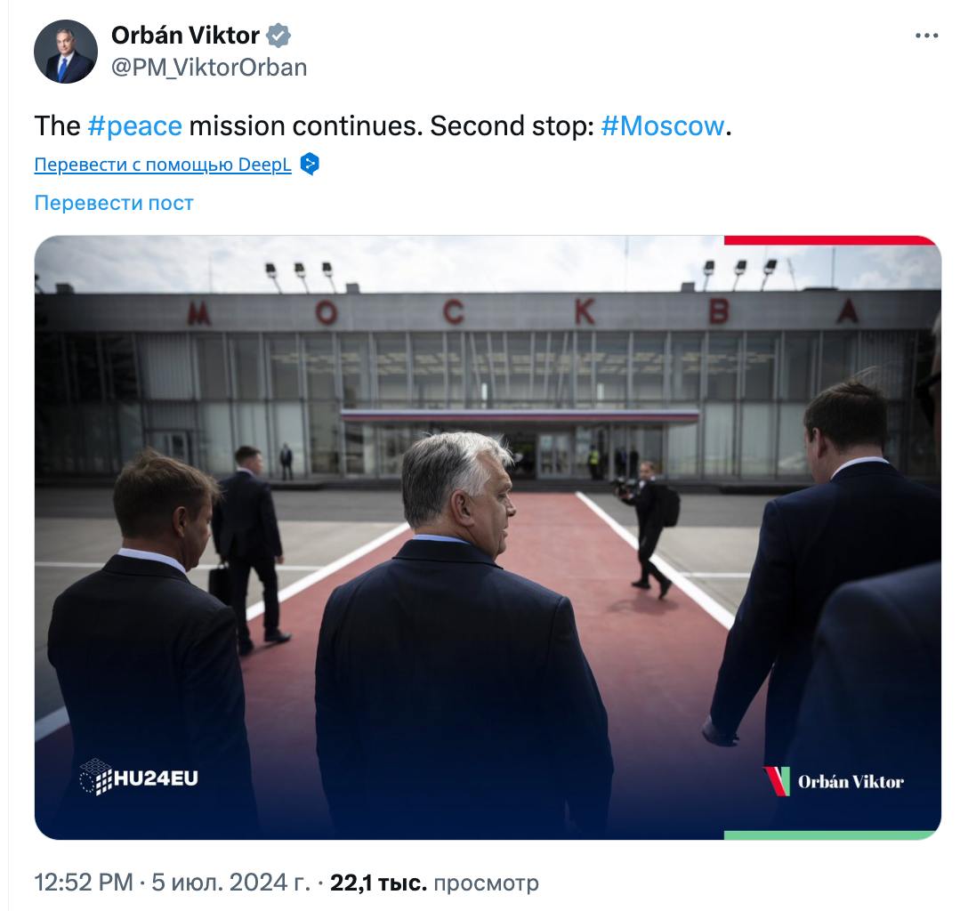 "Миссия мир продолжается. Вторая остановка: Москва", - написал премьер Венгрии в Х.