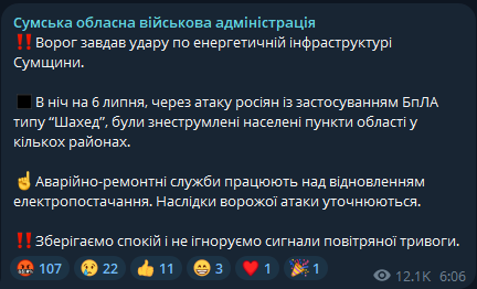 "В ночь на 6 июля из-за атаки россиян с применением БпЛА типа "Шахед" были обесточены населенные пункты области в нескольких районах. Аварийно-ремонтные службы работают над восстановлением электроснабжения. Последствия вражеской атаки уточняются" - говорится в сообщении.