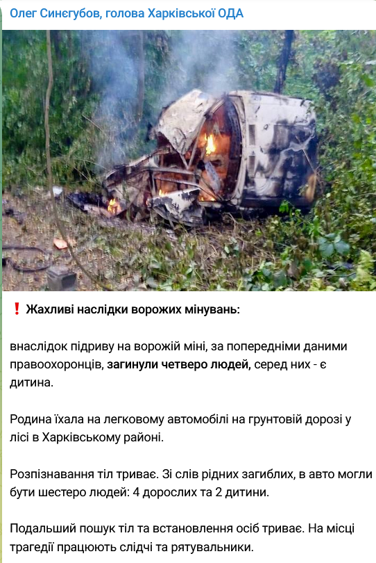 Последствия подрыва авто на мине под Харьковом. Фото: Telegram/synegubov