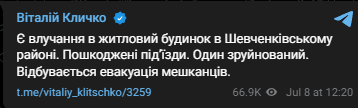 "Есть попадание в жилой дом в Шевченковском районе. Повреждены подъезды. Один разрушен. Происходит эвакуация жителей", - заявил Кличко.