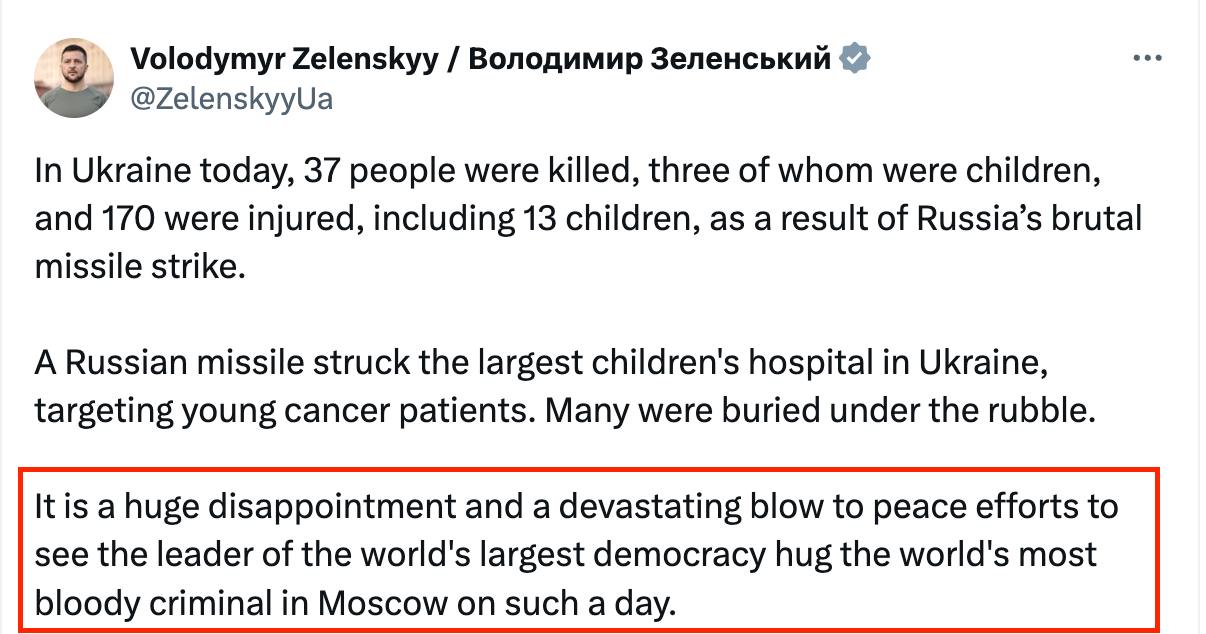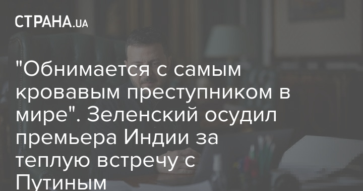 Президент Украины Владимир Зеленский раскритиковал премьер-министра Индии Нарендру Моди за теплую встречу с главой Кремля Владимиром Путиным в день массированного обстрела Украины.