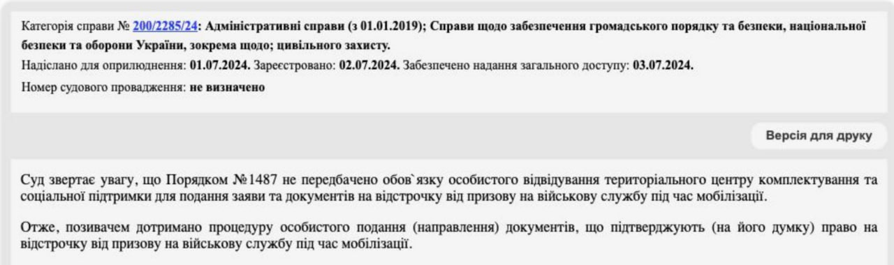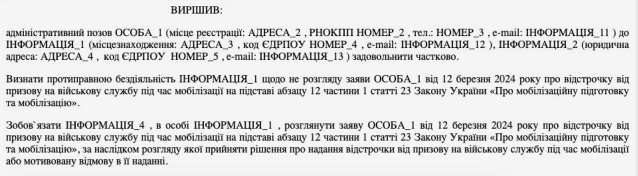 Согласно материалам дела, мужчина обратился в суд с иском против ТЦК, в котором просил признать незаконной бездеятельность ТЦК, поскольку военкомат отказывался рассмотреть его заявление об отсрочке, отправленное рекомендованным письмом.