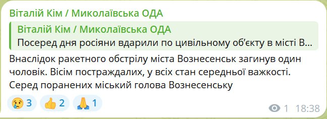 18.40 Мэр Вознесенска ранен во время обстрела города, сообщил глава Николаевской ОВА Ким.