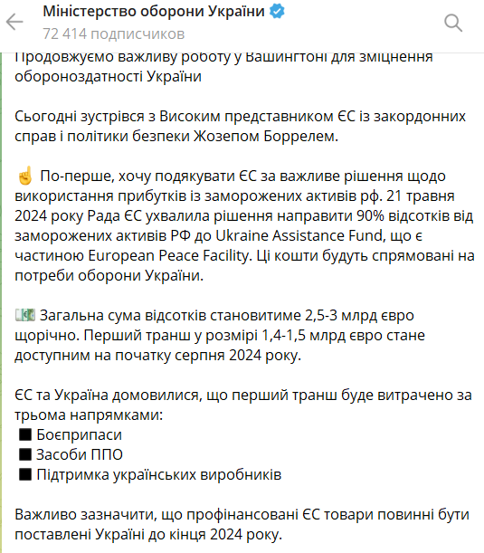 Умеров поблагодарил Евросоюз за решение по использованию доходов из замороженных активов России. Общая сумма процентов будет составлять 2,5-3 млрд евро ежегодно. Первый транш в размере 1,4-1,5 млрд евро станет доступен в начале августа 2024 года.