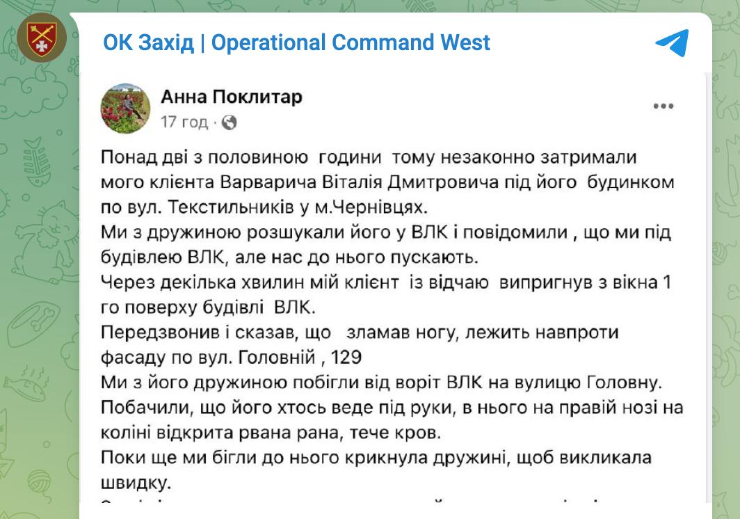15:48 В Черновцах мобилизованный мужчина выпрыгнул с окна первого этажа ТЦК и сломал ногу, сообщает местный адвокат в соцсетях.