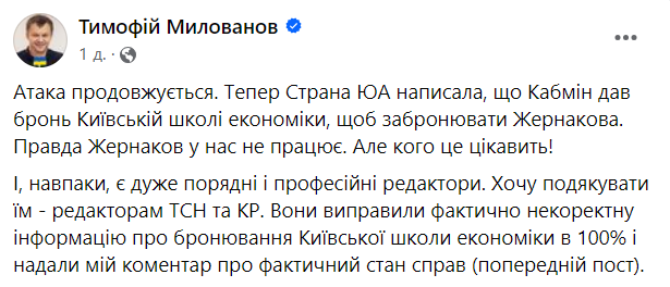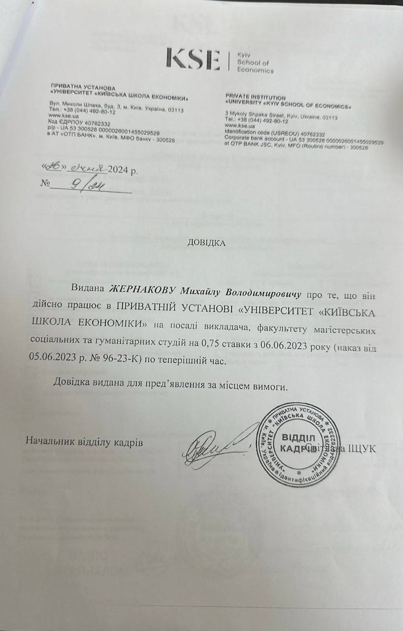 Однако, как выяснилось на днях, в КШЭ Жернаков уже не работает. Стало это известно после недавнего скандала с бронированием от мобилизации 100% сотрудников организаций, которые работают на западные гранты. В их числе была и Киевская школа экономики. В связи с этим СМИ вспомнили историю с преподаванием в ВУЗе Жернакова.