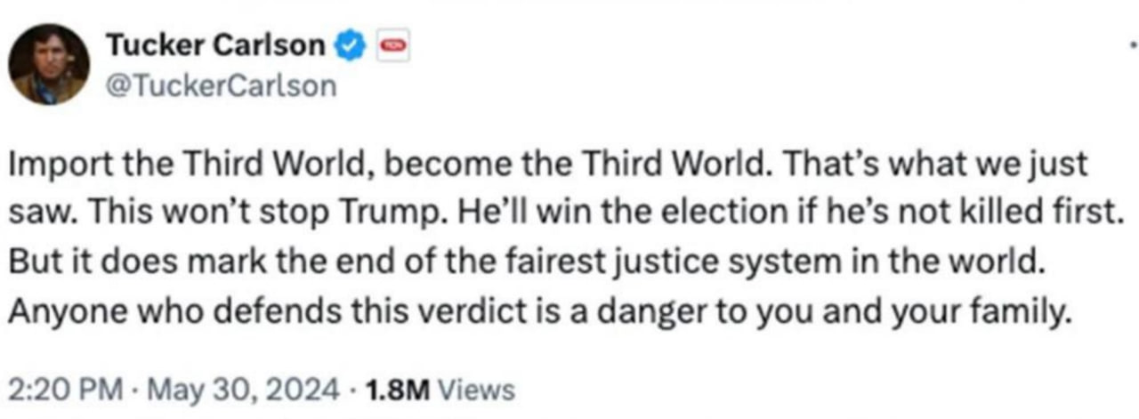 "Они дважды объявляли ему импичмент под нелепыми предлогами. Это не сработало. Он вернулся. Тогда они предъявили ему обвинения. Это не помогло. Он стал еще популярнее. Тогда ему предъявили обвинения еще три раза. И каждый раз его популярность росла. Что дальше? Очевидно, что мы приближаемся к покушению на убийство", - говорит Карлсон на видео.