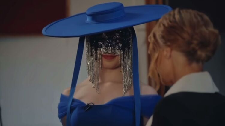 Загадочная певица появилась в кадре в эффектном более откровенном "луке", чем ранее. На артистке было обтягивающие синее платье, но также не обошлось без шляпы, однако теперь она намного меньше.