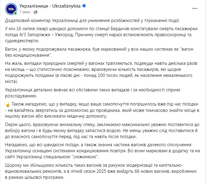По ее информации, в ночь на 16 июля врачи скорой помощи по станции Бердичев констатировали смерть пассажирки поезда 4/3 "Запорожье – Ужгород". Причину смерти устанавливают правоохранители и судмедэксперты. Вагон, в котором путешествовала пассажирка, был маркирован как вагон без кондиционирования.