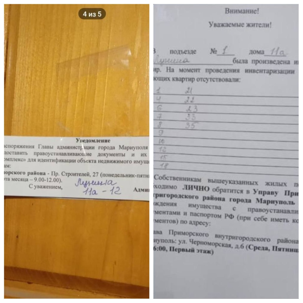 Вот как выглядит уведомление о "бесхозности" жилья на примере Мариуполя. На двери вывешивается уведомление, что владельцу жилья нужно явиться в "органы власти" в течение 30 дней, чтобы доказать право на владение жильем.