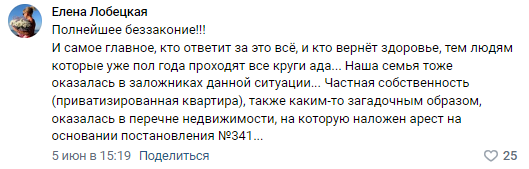 "Полнейшее беззаконие!!! И самое главное, кто ответит за это всё, и кто вернёт здоровье тем людям которые уже полгода проходят все круги ада... Наша семья тоже оказалась в заложниках данной ситуации... Частная собственность (приватизированная квартира), также каким-то загадочным образом оказалась в перечне недвижимости, на которую наложен арест на основании постановления № 341″, — пишет Елена Лобецкая.