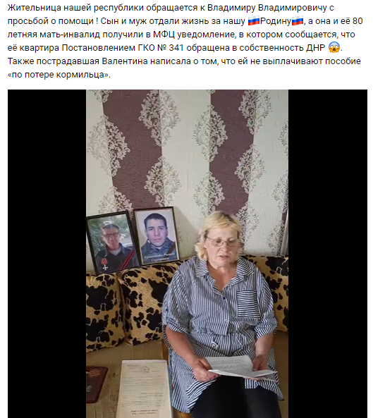 В "тайном списке" постановления № 341 оказалась жительница Макеевки Валентина Романенкова. У нее на войне погибли муж и сын. С жалобой по поводу лишения ее жилья она пожаловалось сразу Путину.