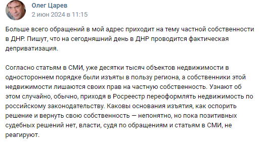 "Больше всего обращений в мой адрес приходит на тему частной собственности в "ДНР". Пишут, что на сегодняшний день в "ДНР" проводится фактическая деприватизация", — отмечал Царев.