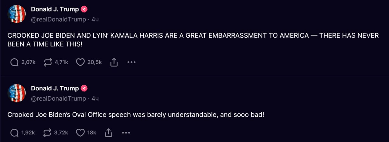 Между тем обращение Байдена уже прокомментировал Дональд Трамп.