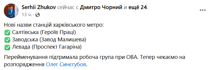 По данным депутата, станцию "Героев труда" хотят переименовать в "Салтовскую", "Завод имени Малышева" - в "Заводскую", станцию "Проспект Гагарина" - в станцию "Левада".