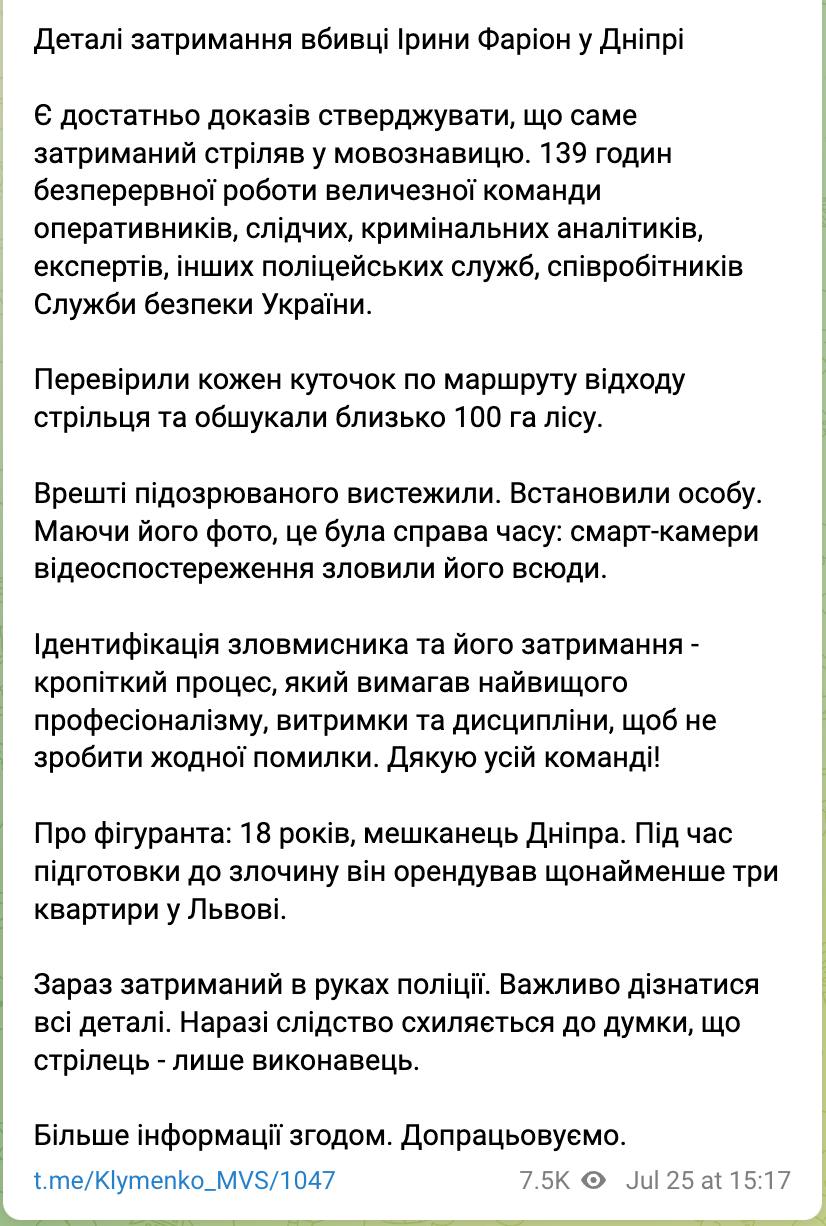 В Днепре задержали подозреваемого в убийстве Ирины Фарион. Это 18-летний парень.