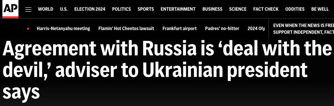 11:13 Подписание мирного соглашения с Россией в ближайшее время "будет равносильно заключению сделки с дьяволом", заявил советник главы ОП Михаил Подоляк в интервью АР.