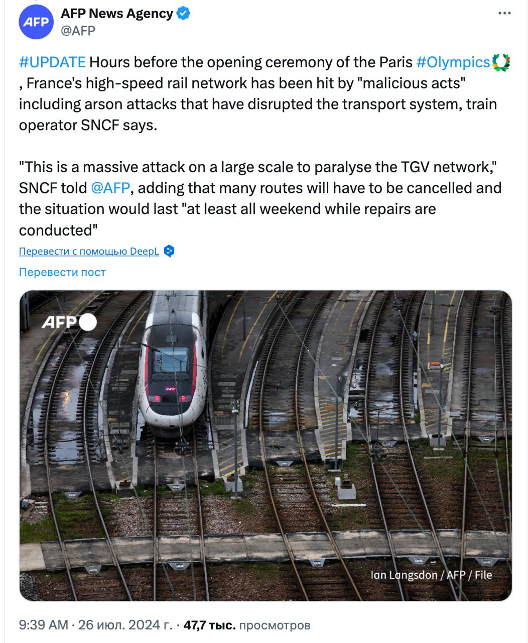 Во Франции ночью произошла серия диверсий на железной дороге за несколько часов до открытия Олимпиады.