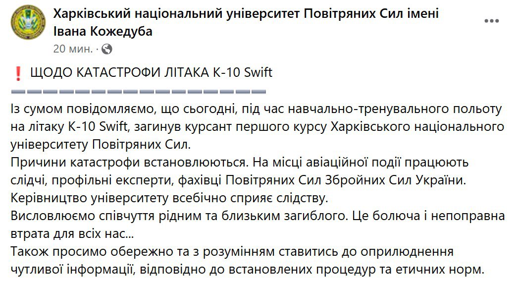 "С грустью сообщаем, что сегодня во время учебно-тренировочного полета на самолете К-10 Swift погиб курсант первого курса Харьковского национального университета Воздушных сил. Причины крушения устанавливаются. На месте авиационного происшествия работают следователи, профильные эксперты, специалисты Воздушных сил Вооруженных сил Украины. Руководство университета всемерно способствует следствию", - сказано в публикации.