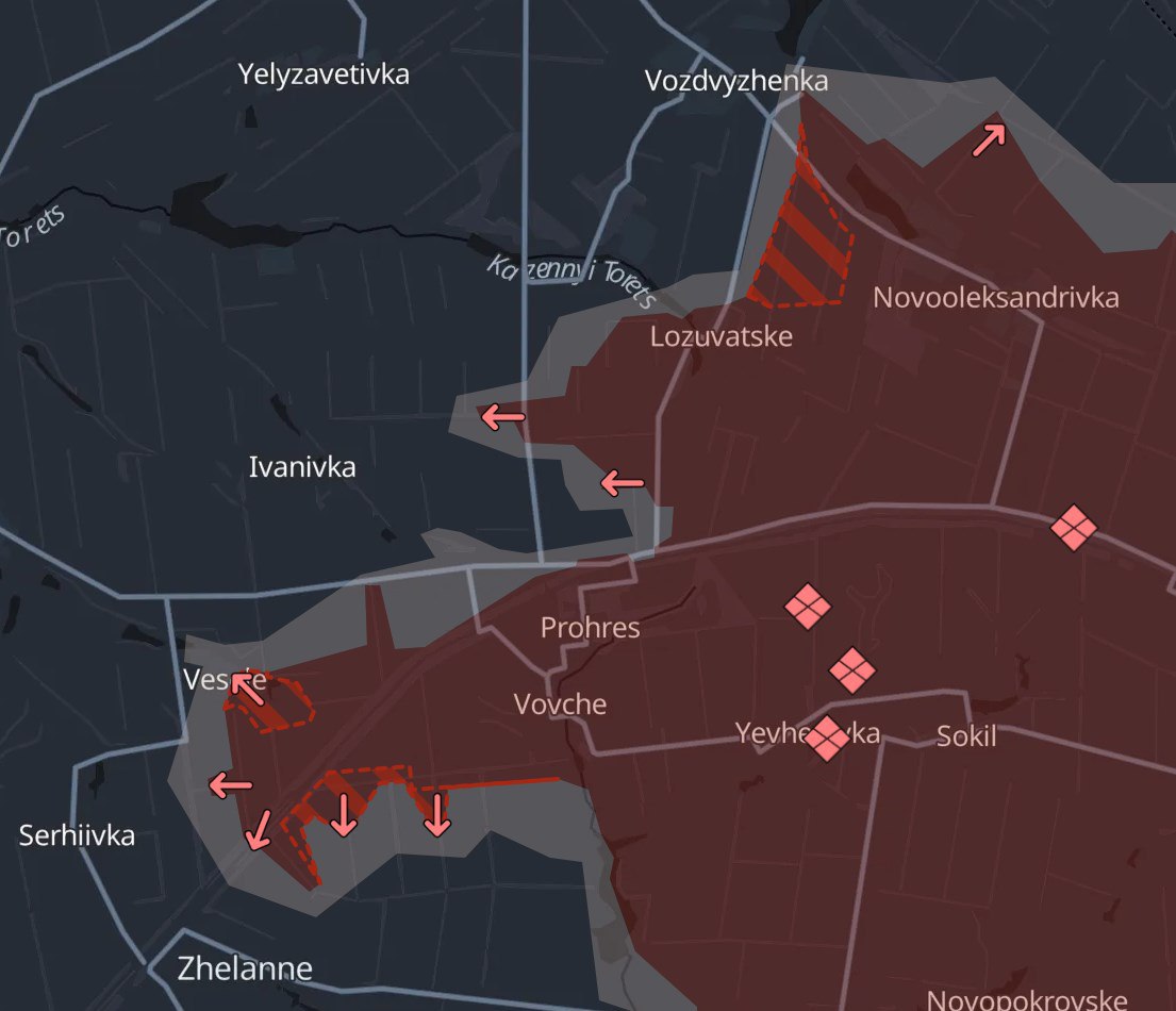 9.46 На Покровском направлении россияне продвинулись за сутки в трех местах - в сторону Воздвиженки (через которую можно выйти на трассу Покровск-Константиновка), в селе Веселом и возле Желанного.