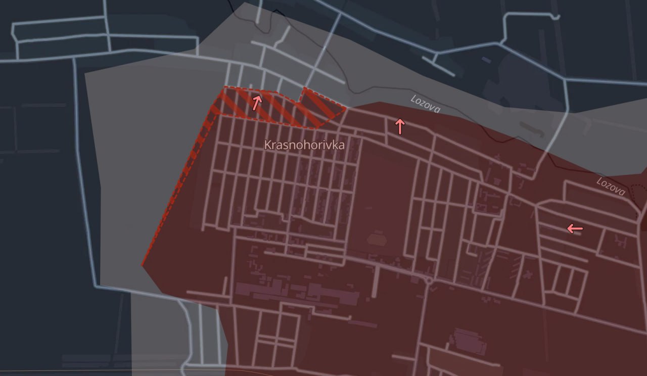 Также новое продвижение РФ на северных окраинах Красногоровки. Большая часть территории города, судя по карте Deep State, находится под контролем россиян.