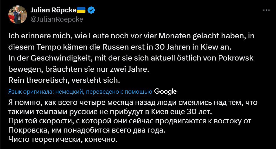 "Я помню, как всего четыре месяца назад люди смеялись над тем, что такими темпами россияне не прибудут в Киев еще 30 лет. При той скорости, с которой они сейчас продвигаются к востоку от Покровска, им понадобится всего два года. Чисто теоретически, конечно", - написал он в Х.