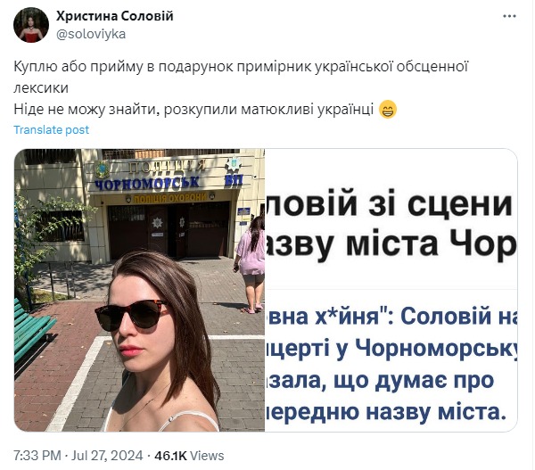 "Куплю или приму в подарок экземпляр украинской обсценной лексики. Нигде не могу найти, раскупили матерные украинцы", – написала исполнительница и прикрепила свое фото на фоне Черноморского отделения полиции.