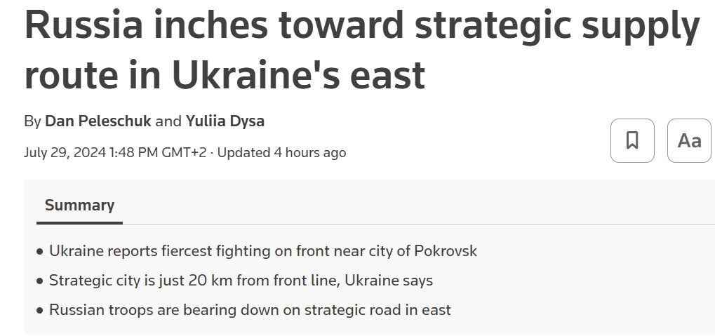 Агентство сообщает, что до этой дороги осталось шесть километров. Она "служит важным маршрутом снабжения других удерживаемых украинцами форпостов, таких как города Часов Яр и Константиновка".