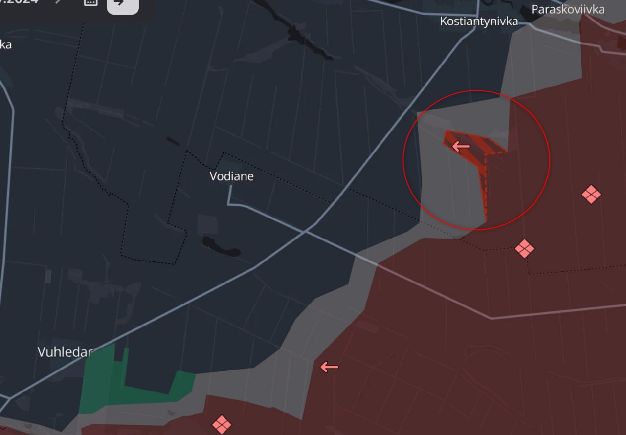 2. Северо-восточнее Угледара, где россияне приблизились к трассе, ведущей на Марьинку. На карте виден "клин", который грозит перерезать участок дороги между Водяным и селом Константиновка (не путать с городом, который расположен севернее).