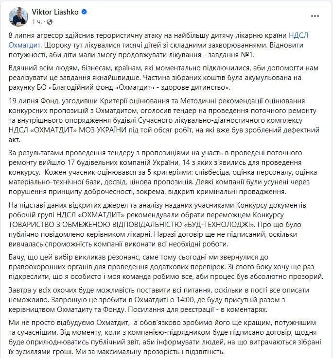 По словам Ляшко, договор с победителем тендера еще не подписан. Министр написал, что из-за резонанса, который вызвал выбор победителя тендера, в "Охматдете" проведут брифинг совместно с руководством больницы и ее благотворительного фонда.