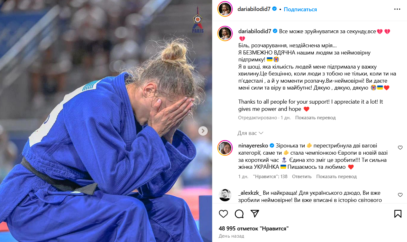 "Боль, разочарование, несбывшаяся мечта… Я безгранично благодарна нашим людям за невероятную поддержку! Я в шоке, какое количество людей меня поддержало в трудную минуту. Это бесценно, когда люди с тобой не только, когда ты на пьедестале, но и в моменты отчаяния. Вы – невероятные! Вы придаете мне силы и веру в будущее! Спасибо, спасибо, спасибо", – написала Белодед.