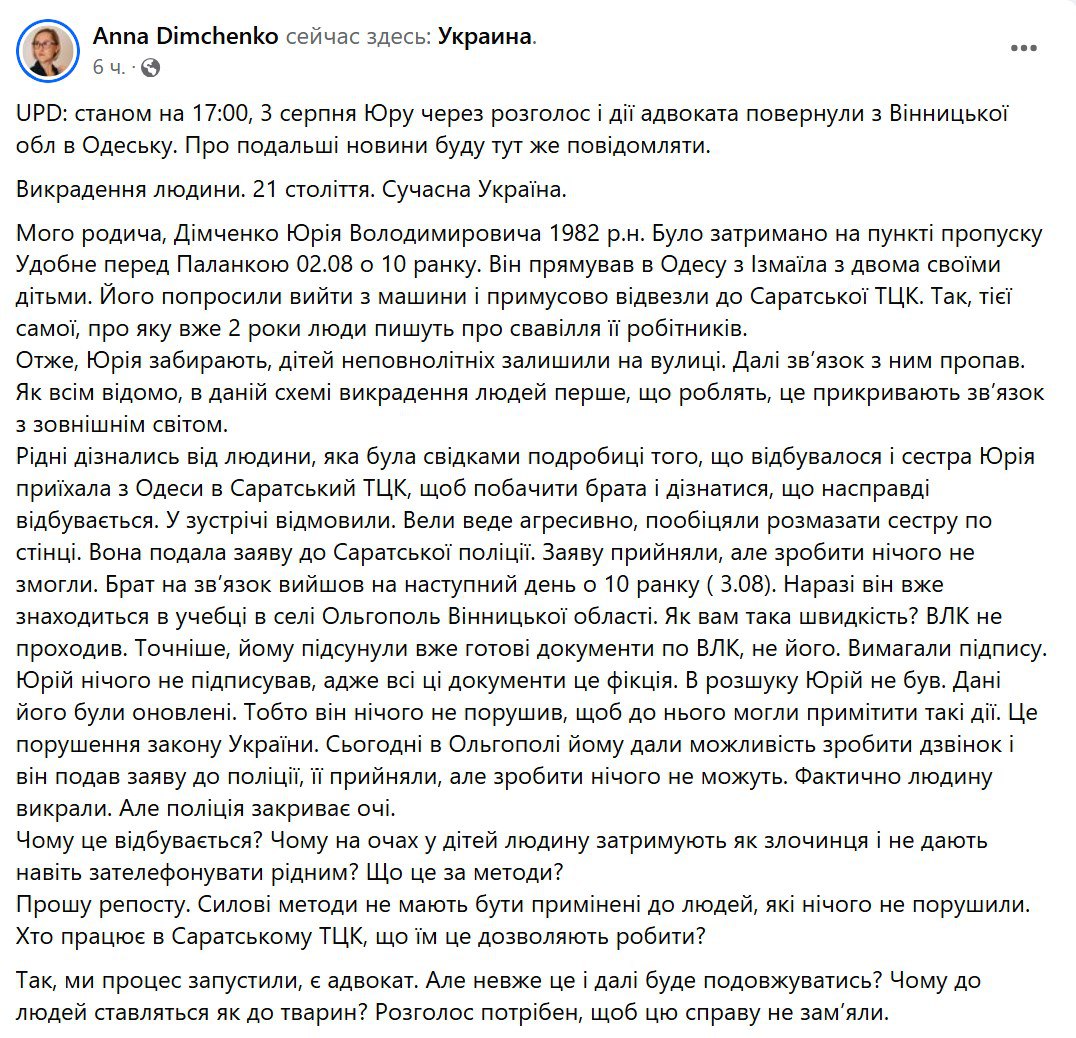 После написания поста в Facebook и огласки мужчину вернули из Винницкой области в Одесскую.