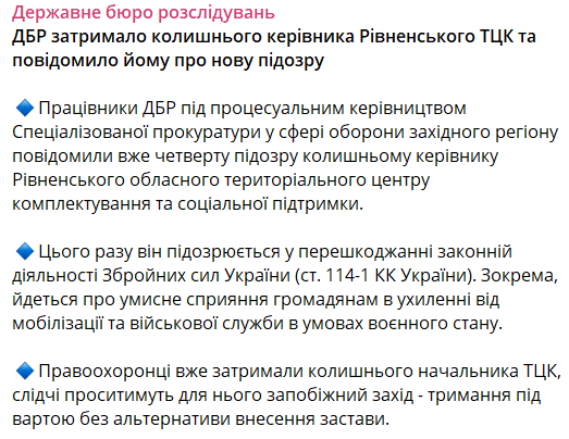 Государственное бюро расследований (ГБР) объявило о новом подозрении бывшему главе Ровенского областного ТЦК.