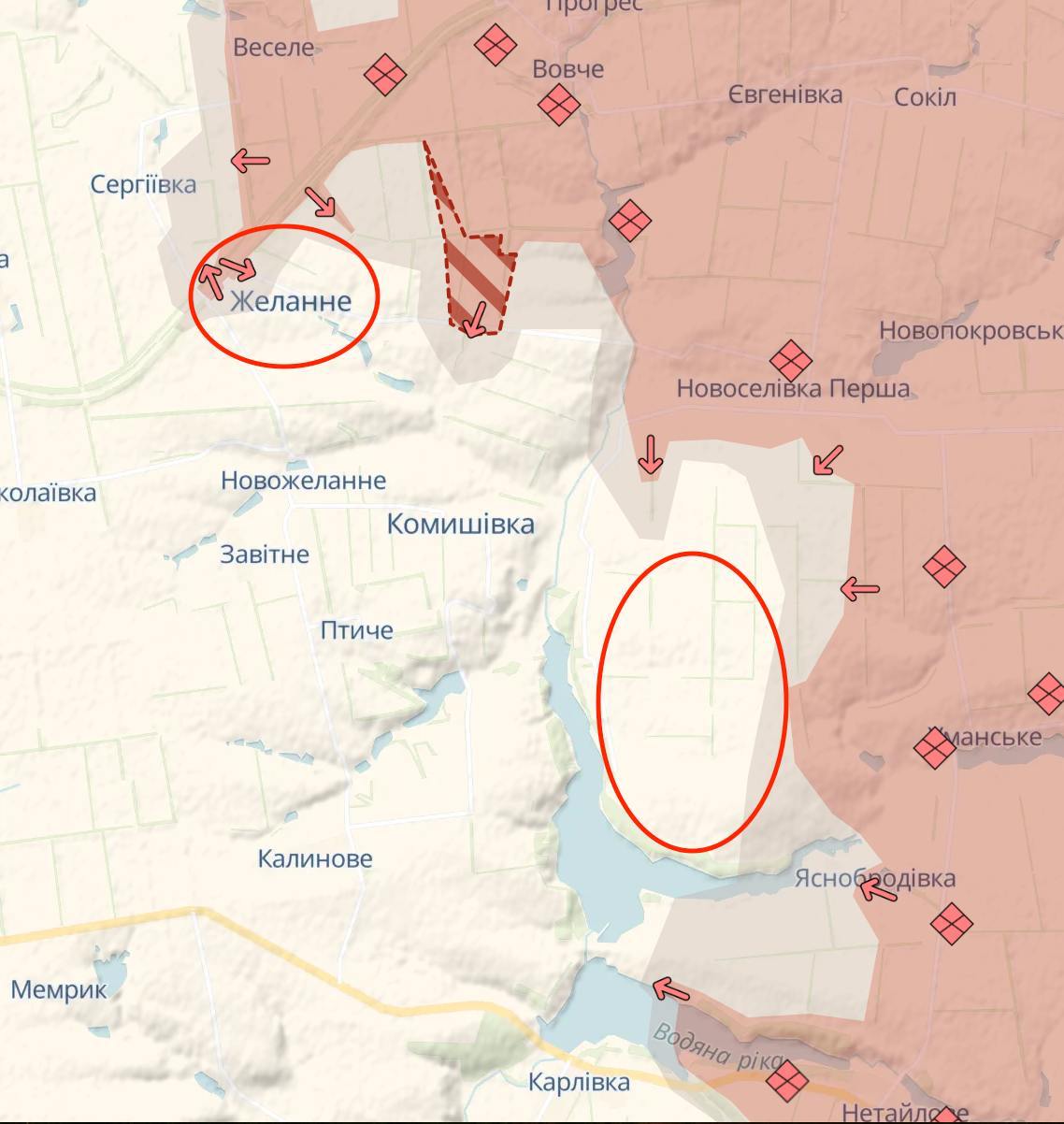 В частности, тактический успех у РФ есть в районе Желанного и Сергеевки, которое россияне пытаются обойти, что "ставит под угрозу" группировку ВСУ на восточном берегу реки Волчья.
