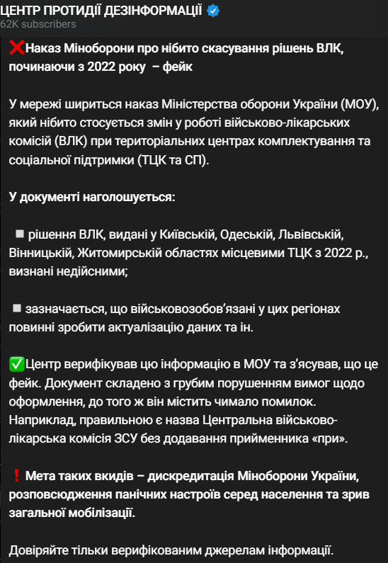 "В сети распространяется „приказ“ Министерства обороны Украины, который якобы касается изменений в работе военно-врачебных комиссий (ВВК) при территориальных центрах комплектования и социальной поддержки (ТЦК и СП). В документе отмечается, что решения ВВК, принятые в Киевской, Одесской, Львовской, Винницкой, Житомирской областях местными ТЦК с 2022 г. признаны недействительными, и отмечается, что военнообязанные в этих регионах должны сделать актуализацию данных и прочее", - говорится в сообщении.