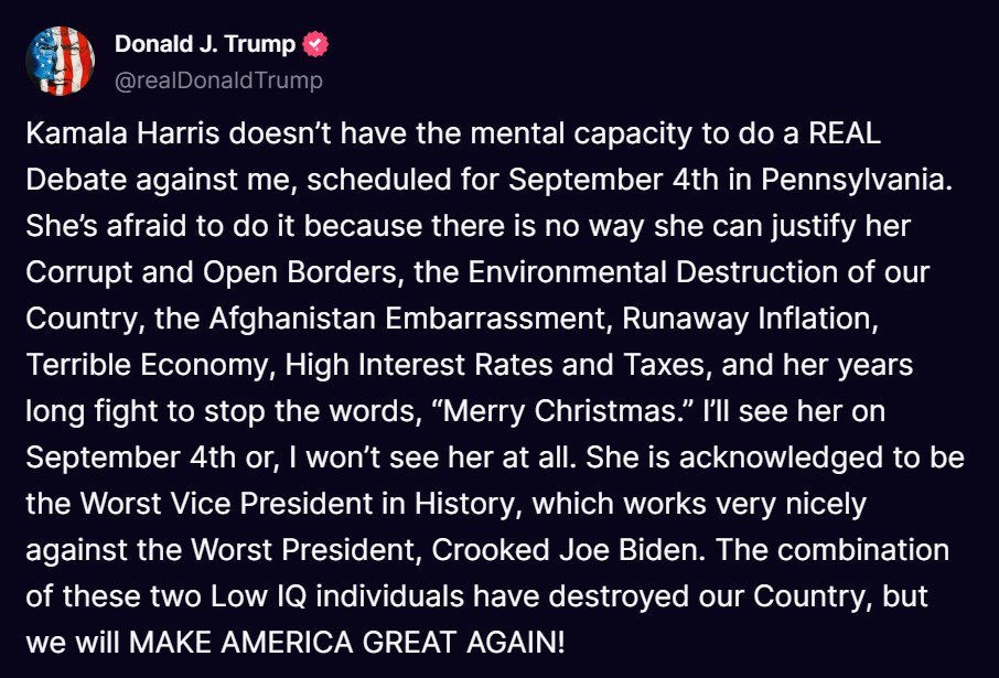 Он также добавил, что "у Камалы Харрис нет умственных способностей, чтобы провести реальные дебаты против меня, запланированные на 4 сентября в Пенсильвании".