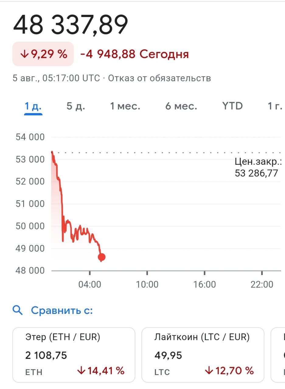 Если считать за последнюю неделю, то биткоин обрушился на 19,6%, эфир почти на 30%.