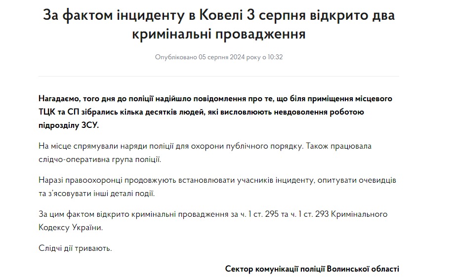 Полиция открыла уголовные производства из-за митинга под Ковельским ТЦК с требованием отпустить задержанных военкомами мужчин. Дела открыты по статьям о публичных призывах к совершению действий, нарушающих общественный порядок, и групповому нарушению общественного порядка.