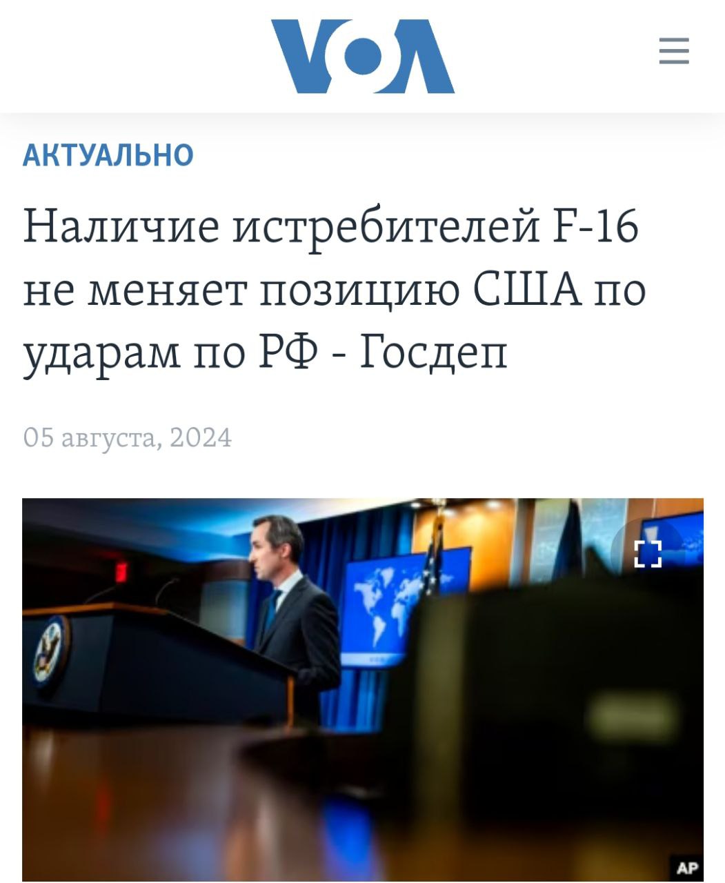 Наличие истребителей F-16 у Украины не меняет позицию США по ударам вглубь российской территории.