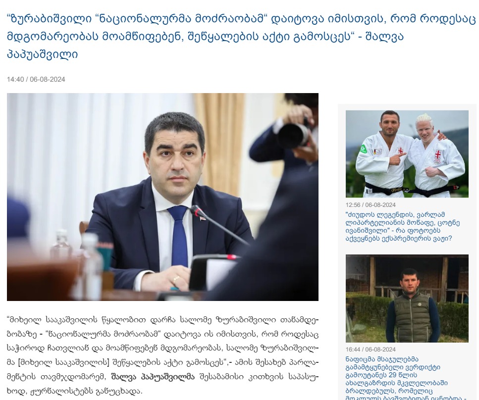 Как пишет грузинское издание Ambebi.GE, об этом сегодня сказал журналистам спикер грузинского парламента Шалва Папуашвили.