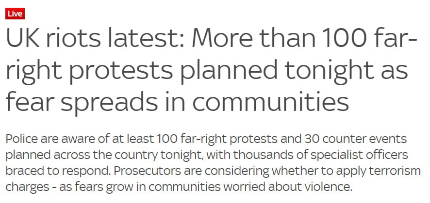 Британской полиции известно о подготовке уже по меньшей мере сотни акций ультраправых по всей территории страны, которые могут снова перерасти в беспорядки.