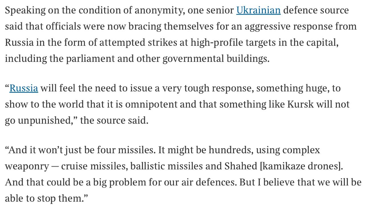 "Россия чувствует необходимость дать очень жесткий ответ, нечто грандиозное, чтобы показать миру, что она всемогуща и что нечто вроде Курска не останется безнаказанным", - сказал источник.