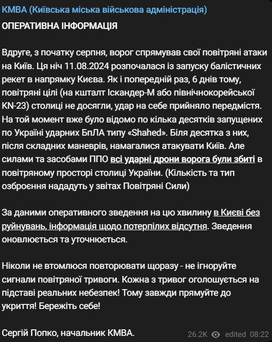 В ночь на 11 августа Киев подвергся массированной атаке ракет и беспилотников. Об этом сообщил глава Киевской городской военной администрации Сергей Попко.
