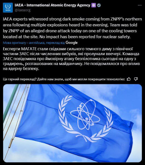 В свою очередь МАГАТЭ передает сообщения россиян об ударе беспилотника по градирне (охладительному агрегату) Запорожской АЭС.