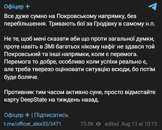 "Даже во многих СМИ никому нафиг не сдался тот Покровск и другие направления, когда есть победа. Победа хорошо, особенно когда успехи реально есть, но нужно трезво оценивать ситуацию повсюду, потому что потом будет больно. Противник тем временем активно наступает, просто отмотайте карту DeepState на неделю назад", - написал военный.