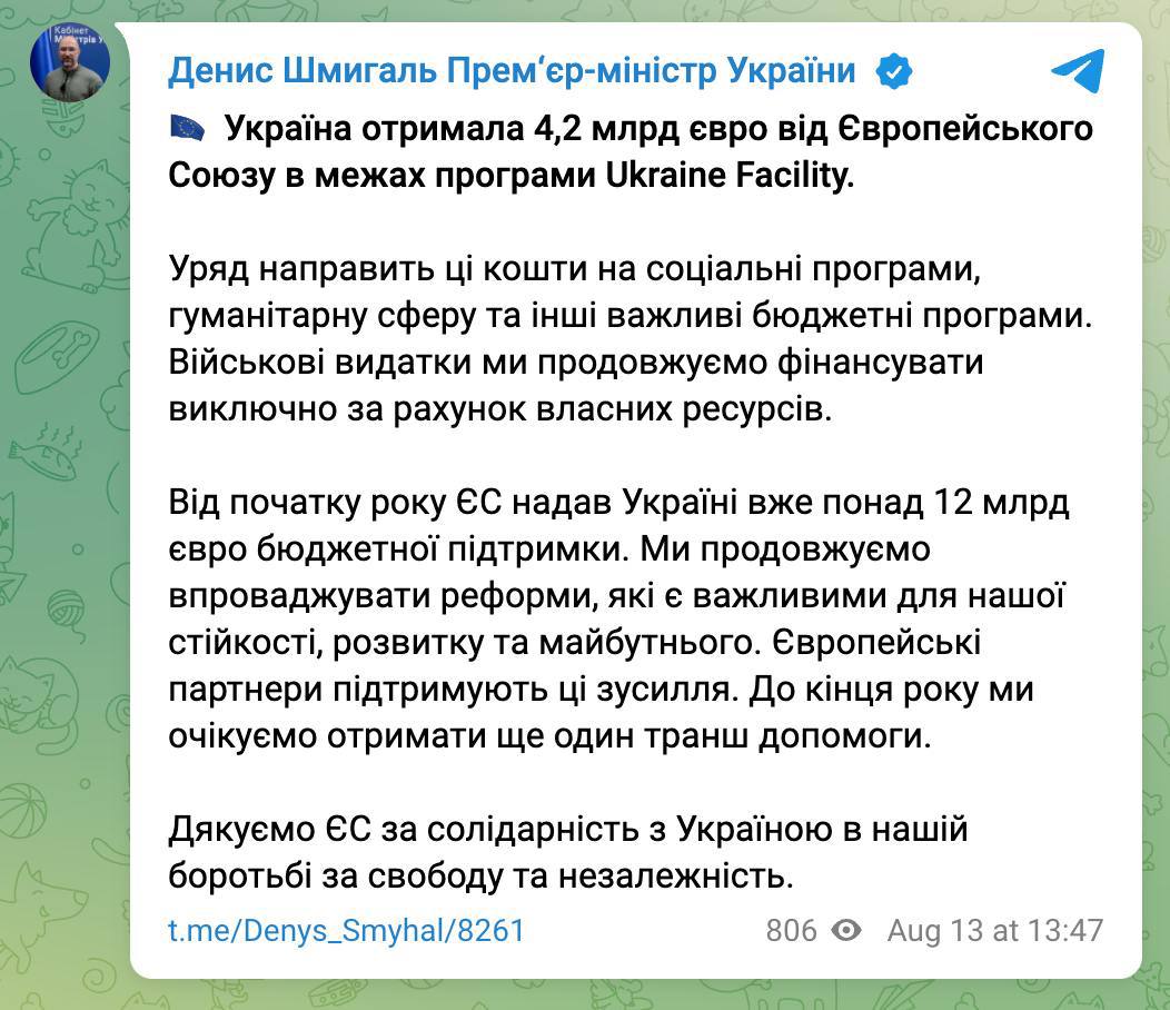 Украина получила 4,2 млрд евро от ЕС по программе Ukraine Facility.